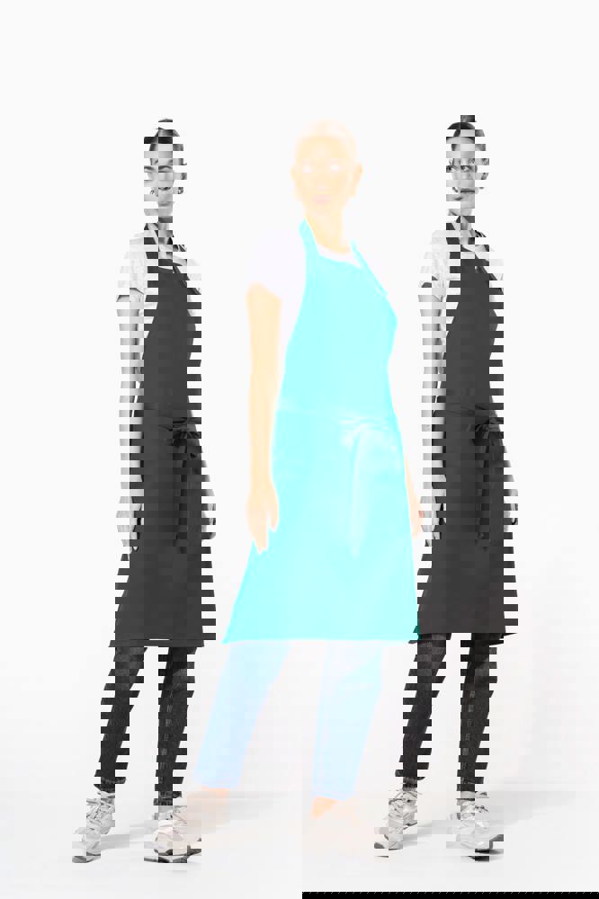 65% polyester / 35% katoen (Denim, Black Denim 65 % katoen / 35 % polyester). Thuis wassen op 60 °C. Metalen gesp aan de hals om de schort in lengte aan te passen. Zonder zak. Afmetingen: H 90 cm - B 76 cm.