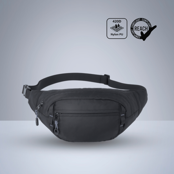Een lichte en duurzame heuptas van 420D-nylon met PU-coating. Voorzien van een hoofdvak met rits, een voorvak met rits en een reflecterend elastisch koord voor extra zichtbaarheid. Het gevoerde mesh-rugpaneel zorgt voor comfortabel dragen tijdens elke activiteit. Ideaal voor reizen, hardlopen en dagelijkse benodigdheden.