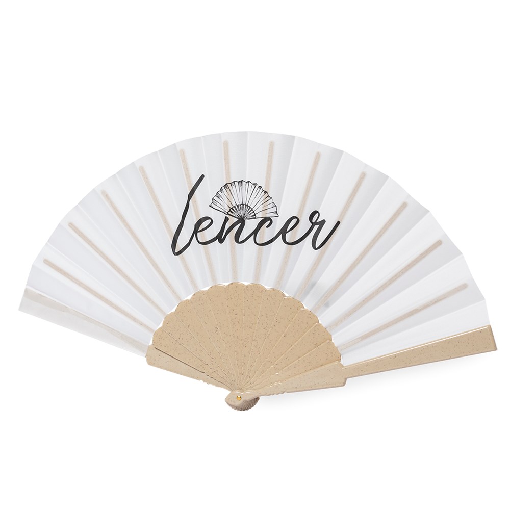 Natuurlijke waaier met bamboevezelribben en -weefsel in RPET-materiaal, verkregen uit gerecycleerde plastic materialen, om het hergebruik van plastic resten te stimuleren en bij te dragen aan de duurzaamheid van de aarde. Gepresenteerd in een individuele, eco-design box.